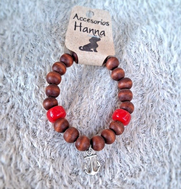 Pulsera elástica pelotitas de madera y acrílico-dije ancla