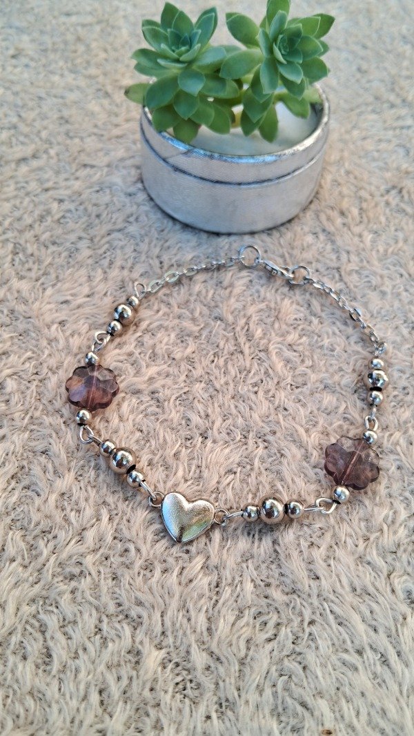 Tobillera de fundición dije corazón, flores de acrílicos y pelotitas de níquel